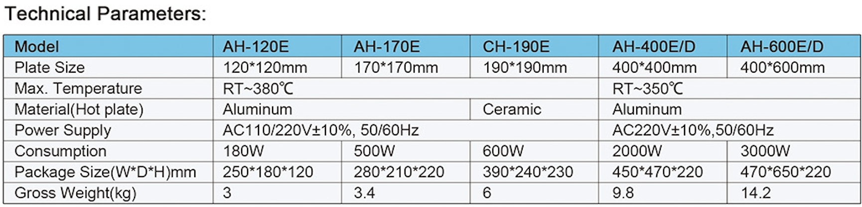 - Enclosed hot plate with flame protection, fast warm-up and durability